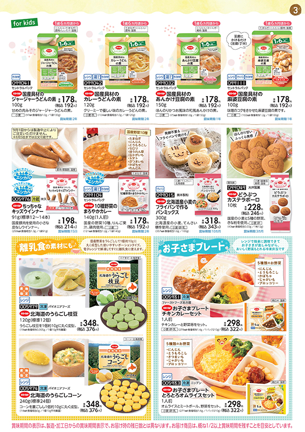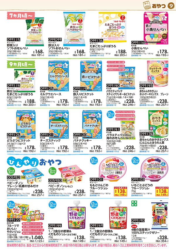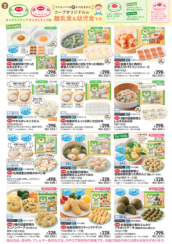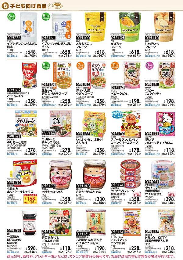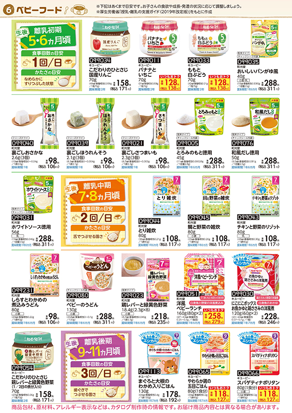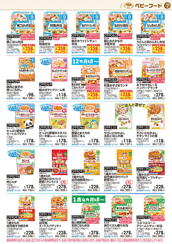 離乳食~幼児食の食品、ベビーシャンプーや紙おむつなどの日用品、必需品をそろえています。