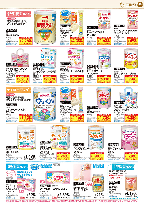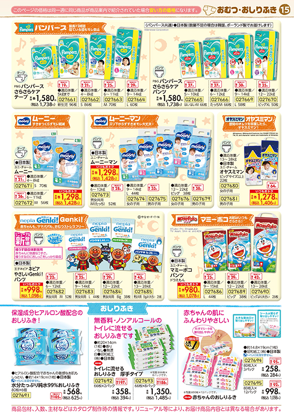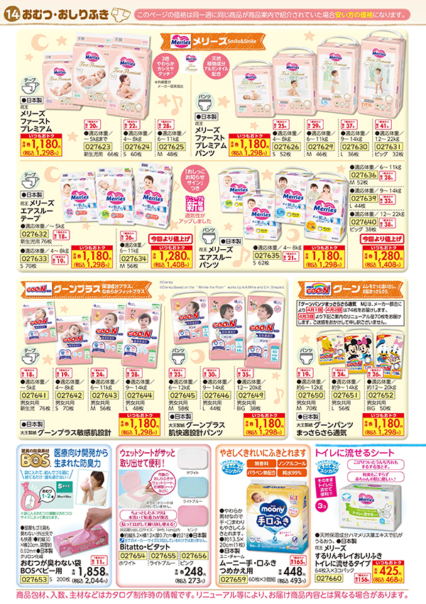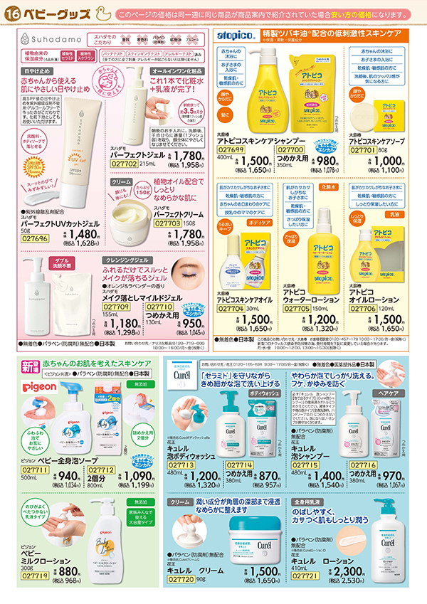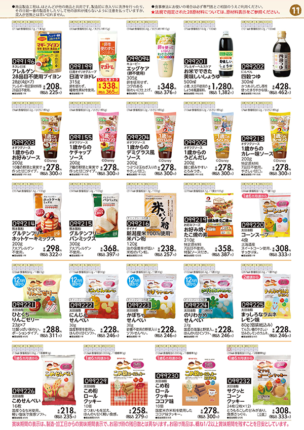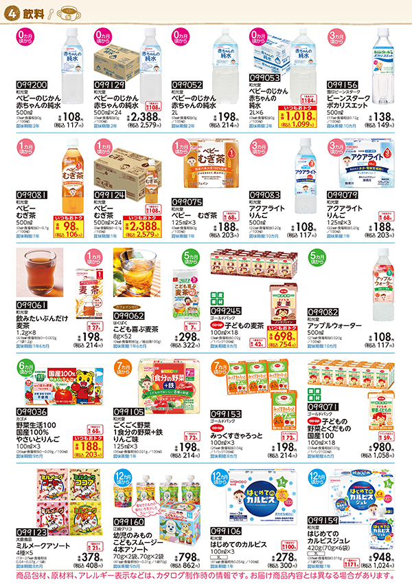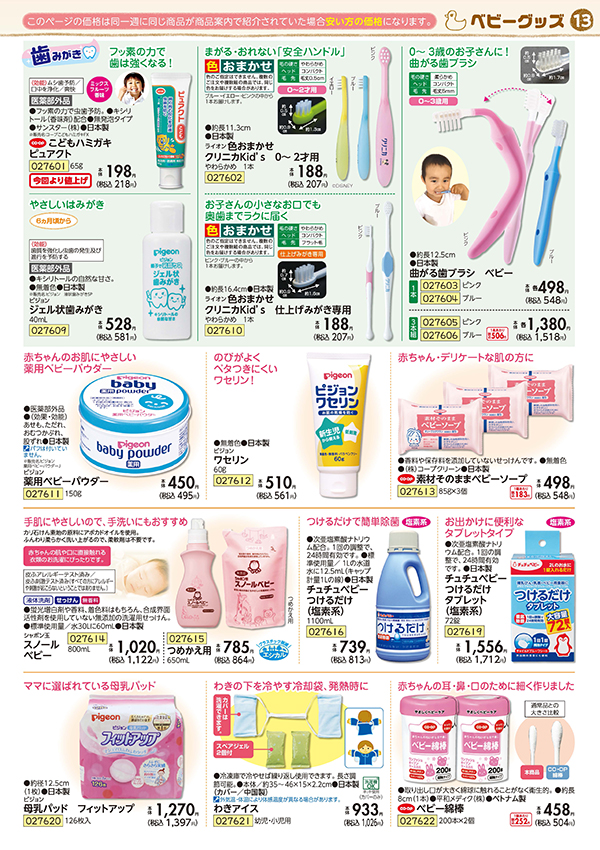 離乳食~幼児食の食品、ベビーシャンプーや紙おむつなどの日用品、必需品をそろえています。